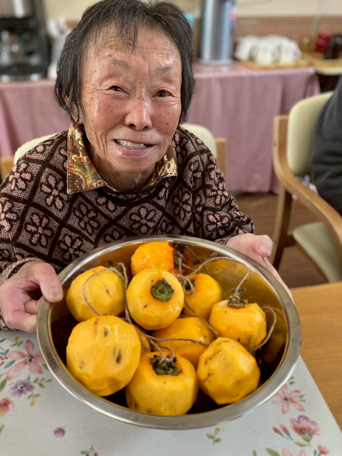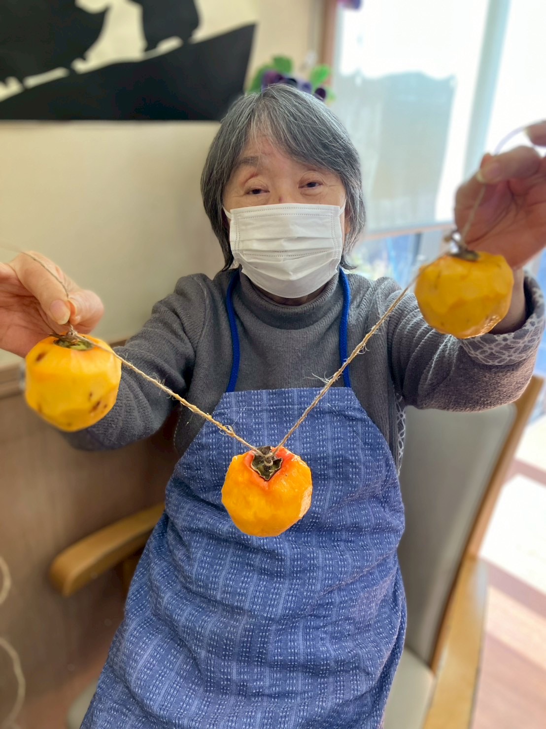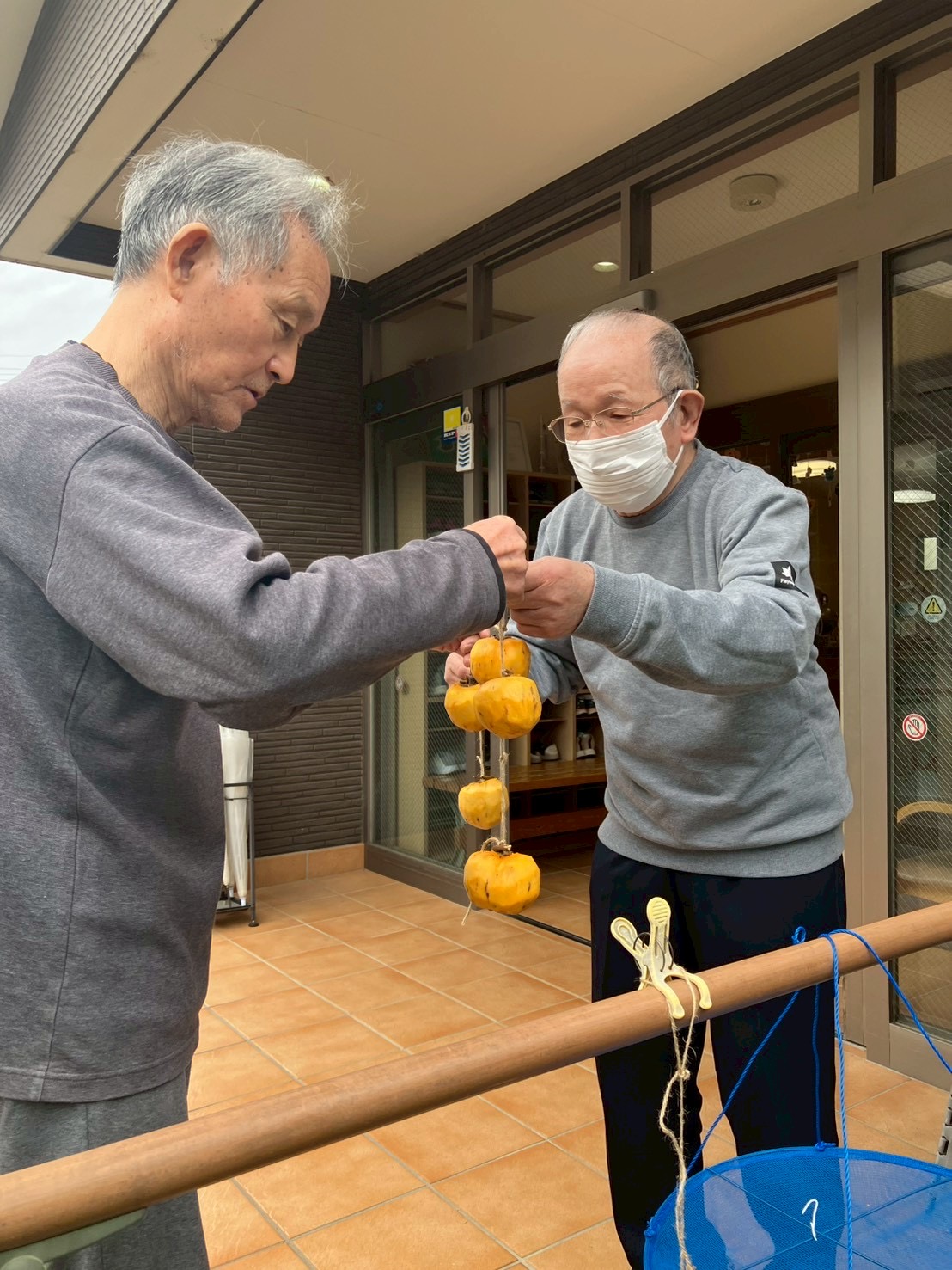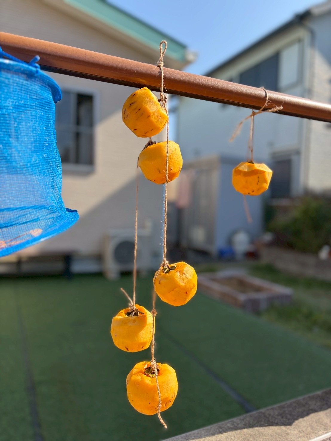 渋柿は紐でくくり、干し柿作りに挑戦!