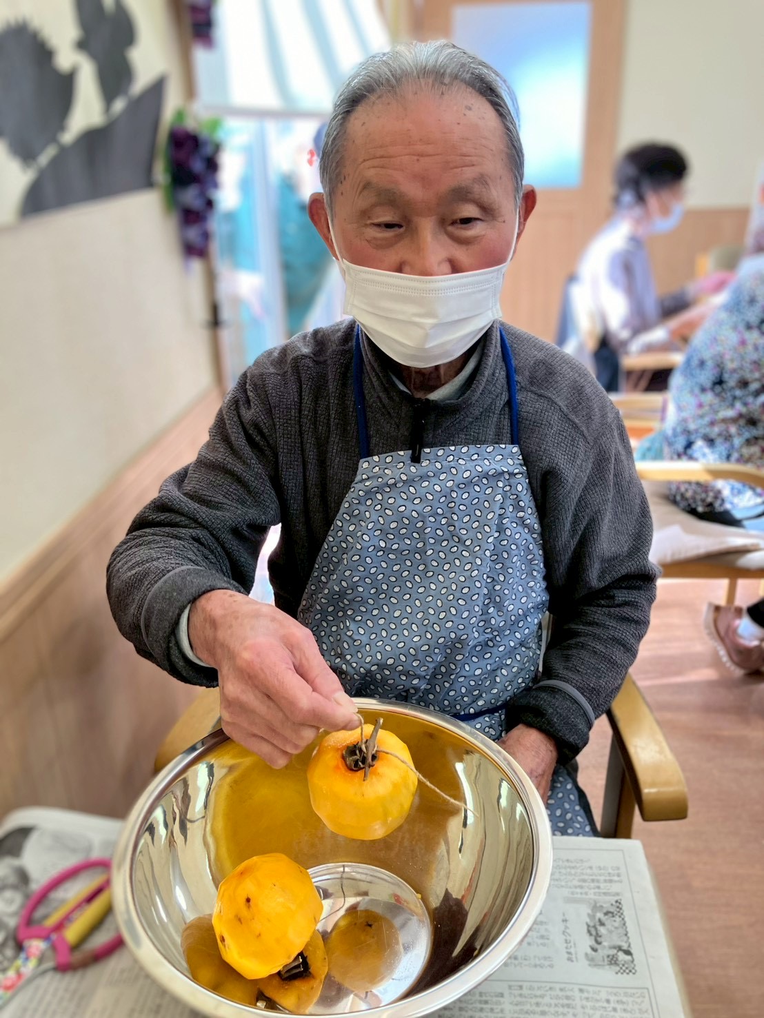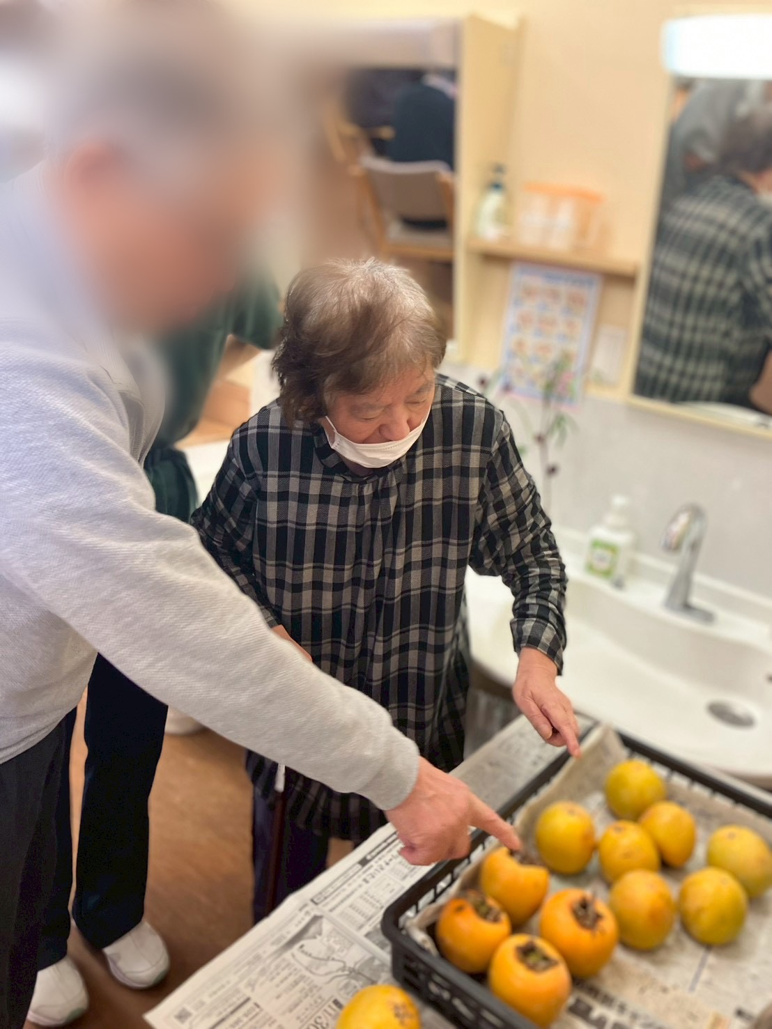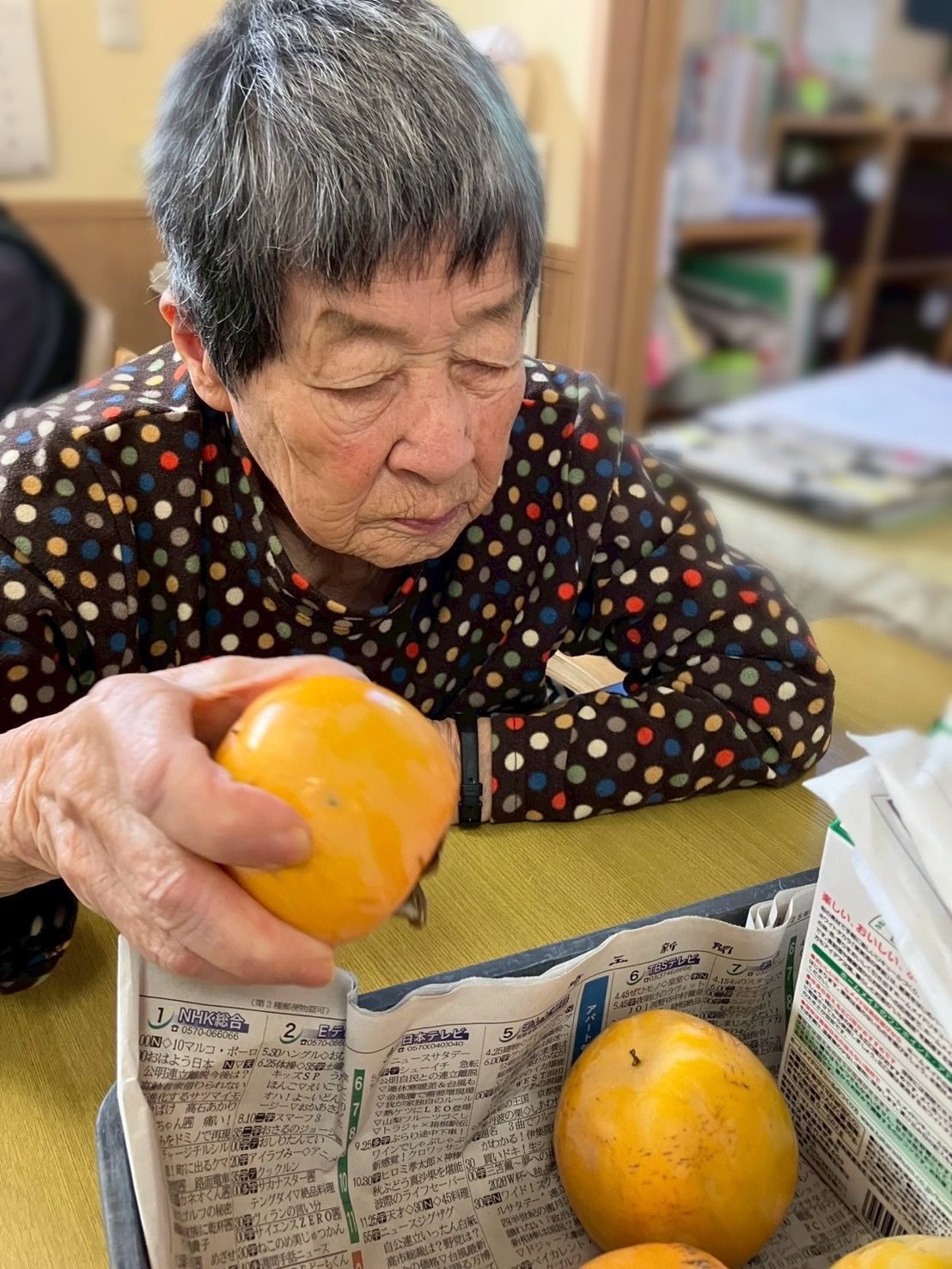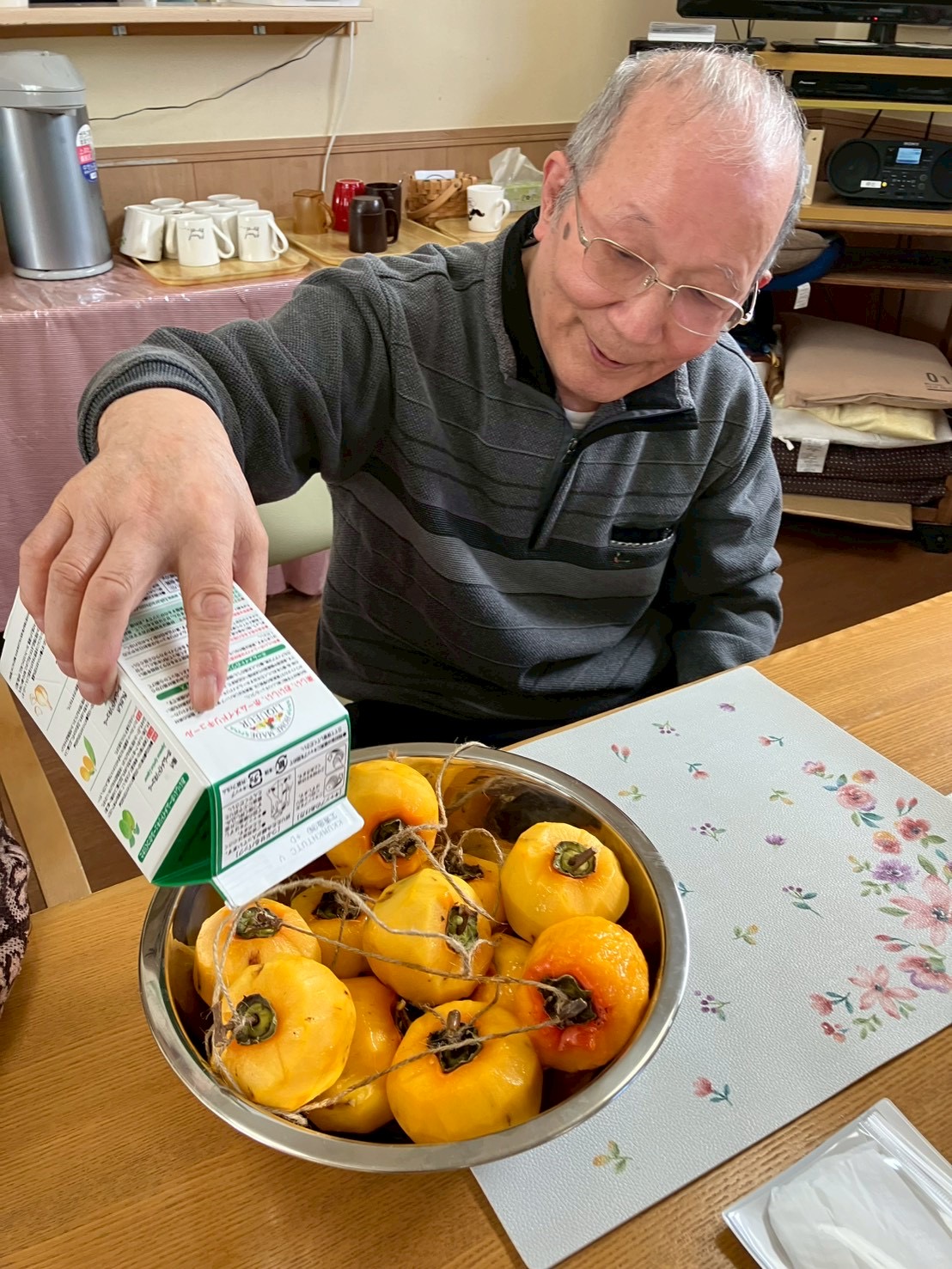 渋柿は紐でくくり、干し柿作りに挑戦!