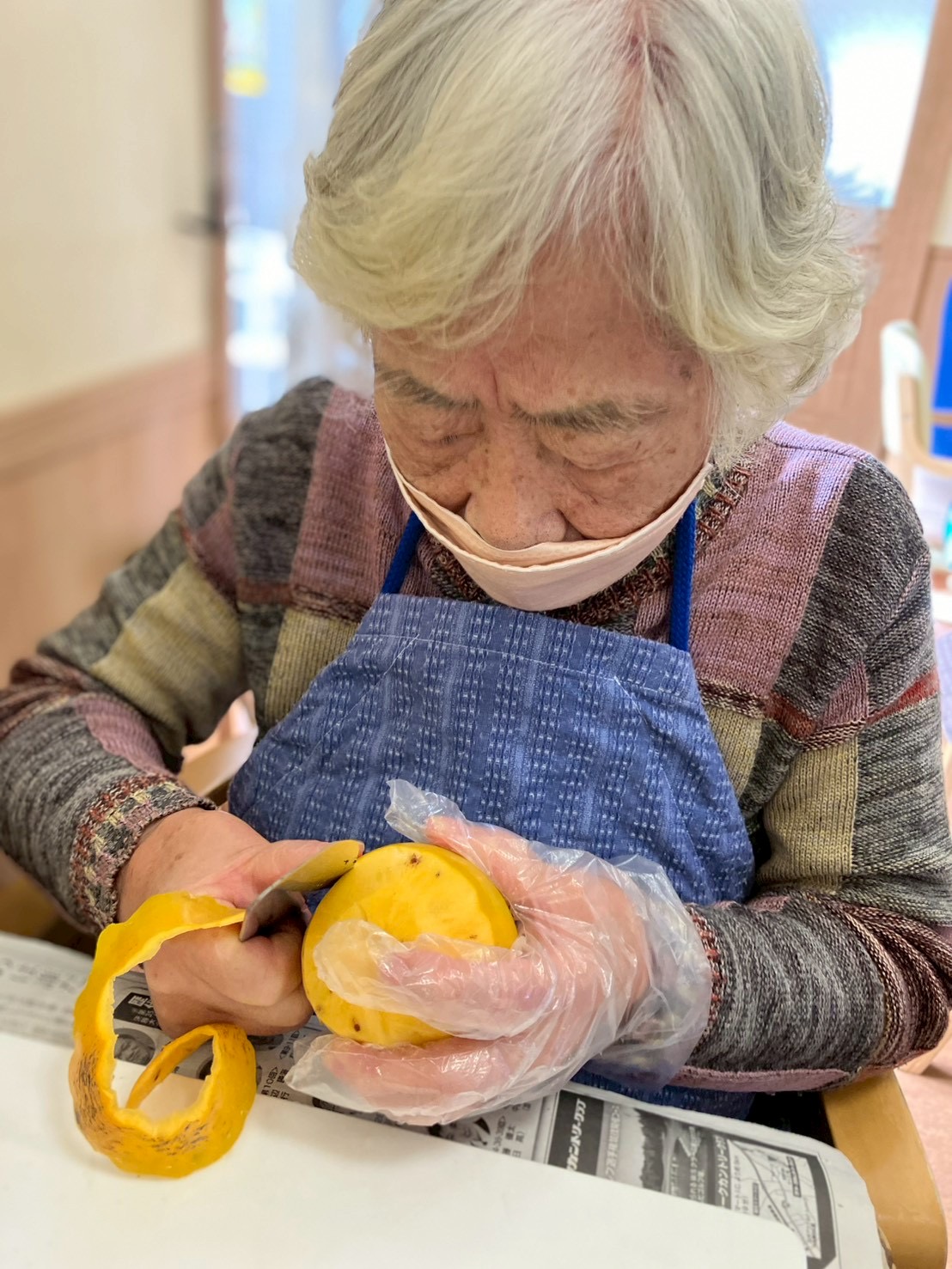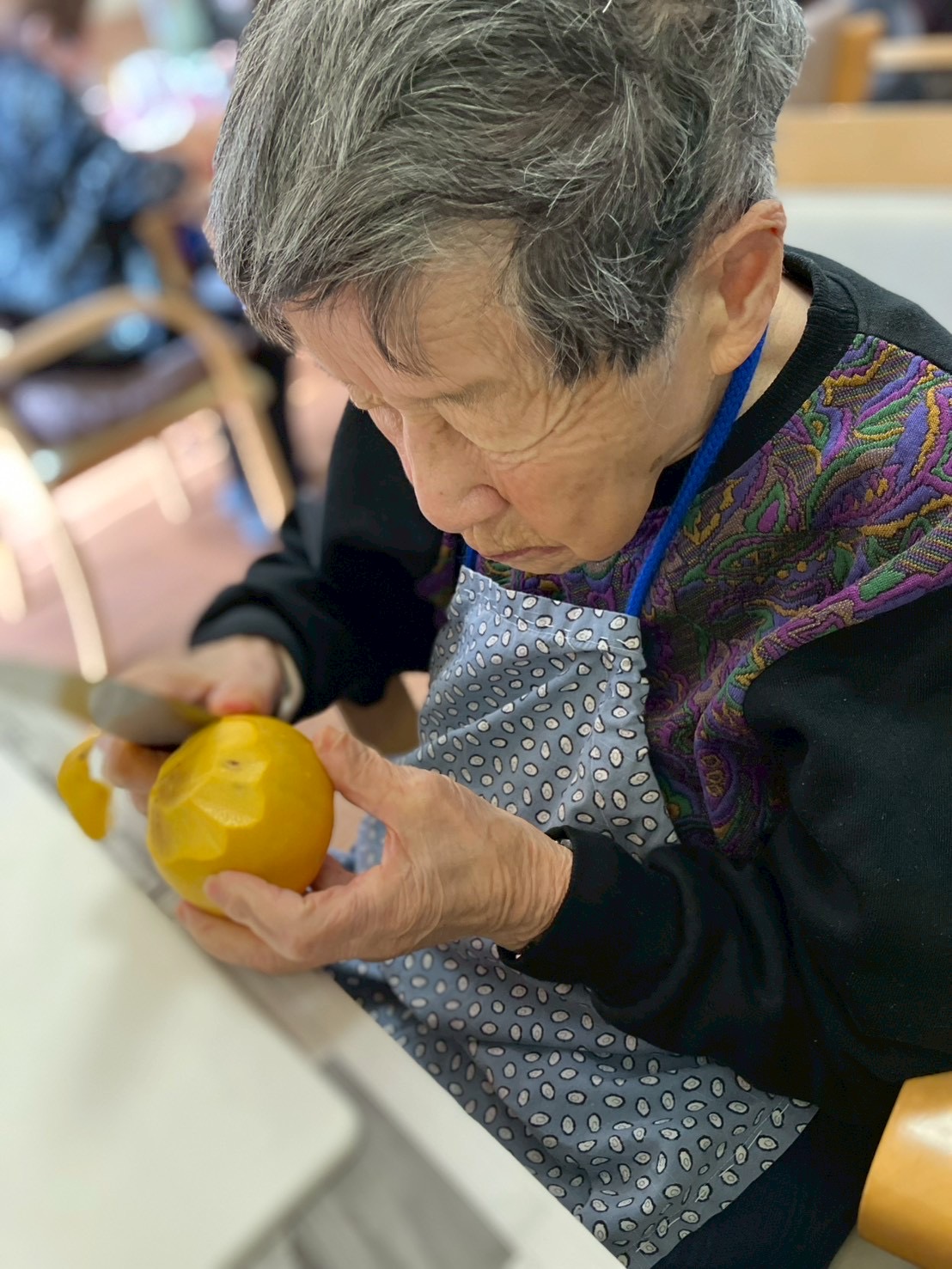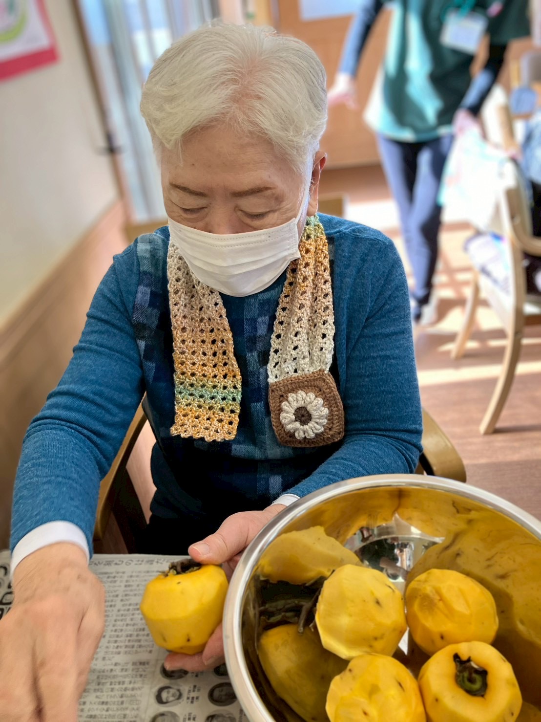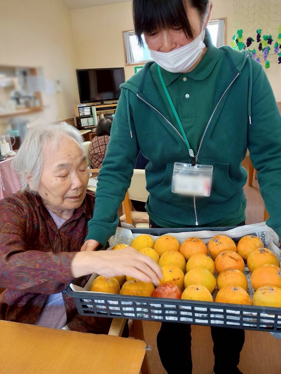渋柿は紐でくくり、干し柿作りに挑戦!