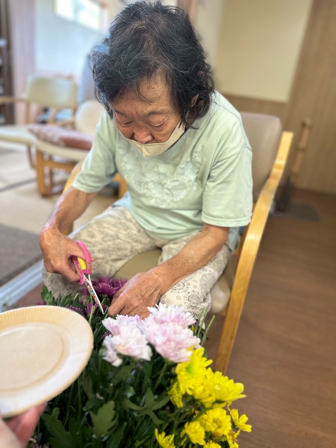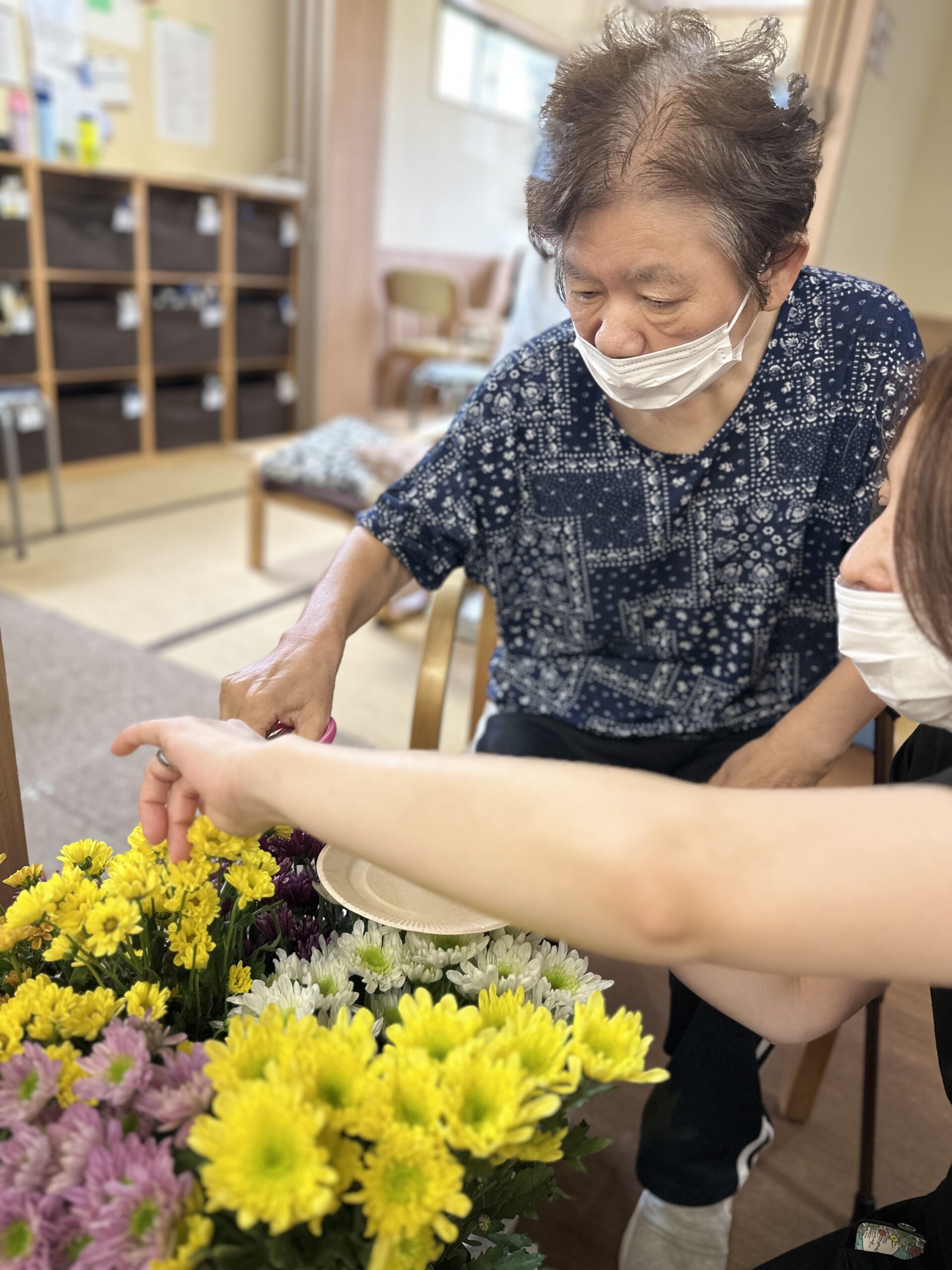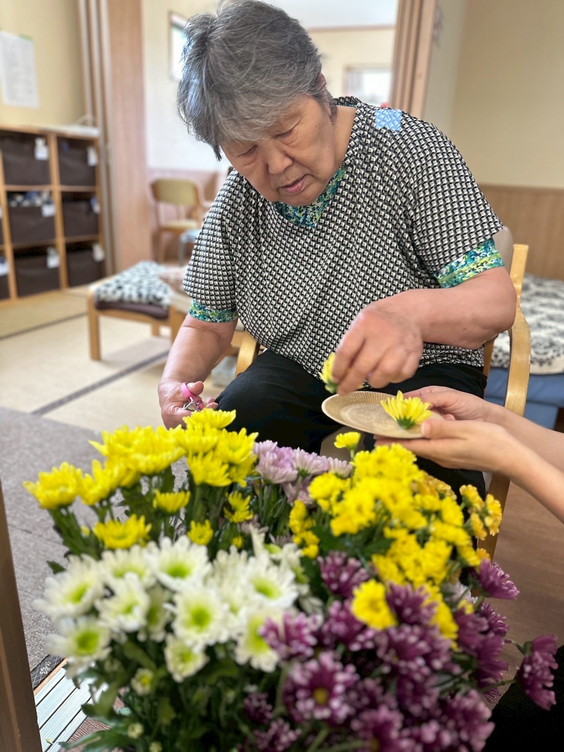 楽しそうに選んで切る方や、菊の花を摘むのを