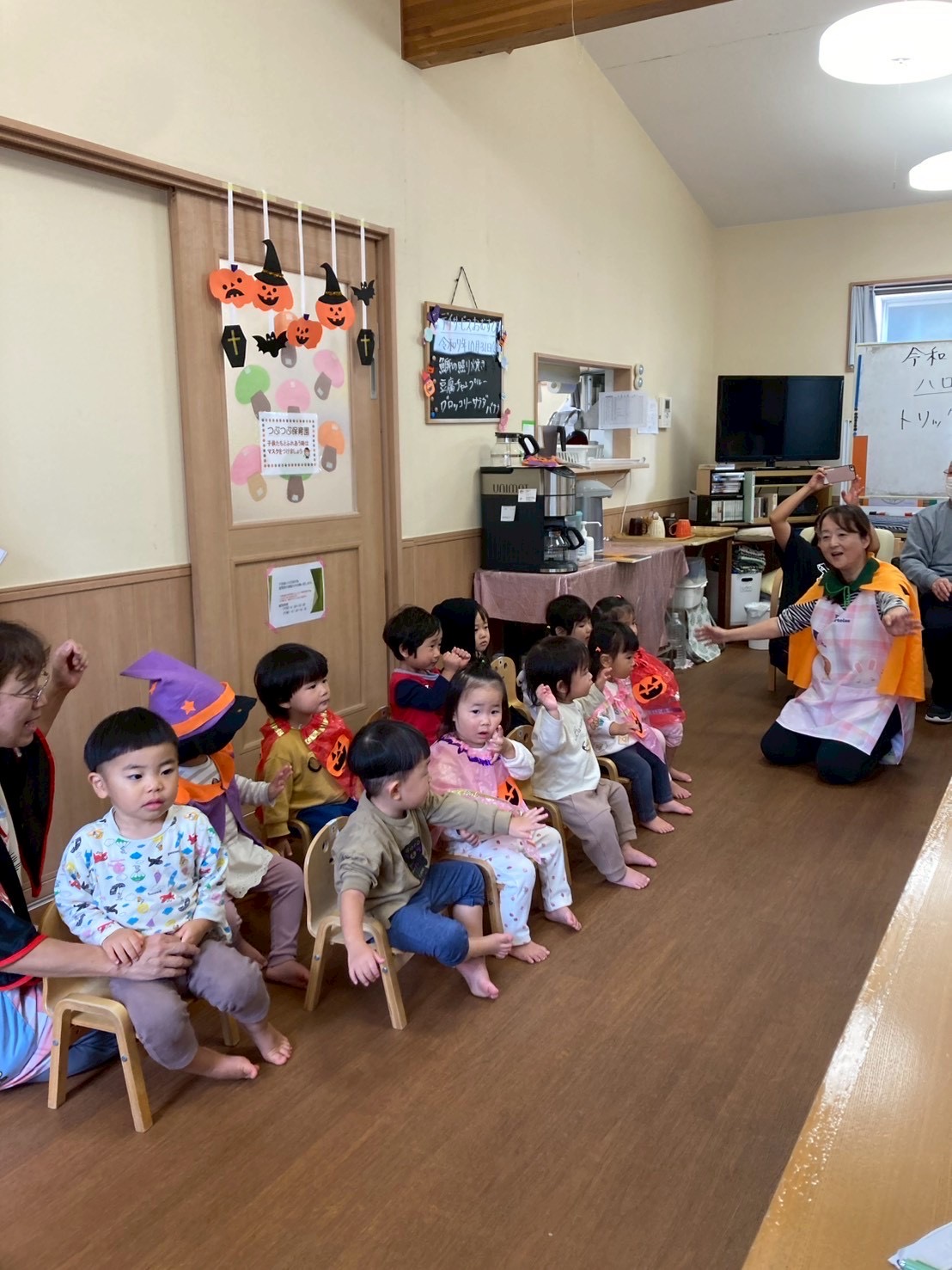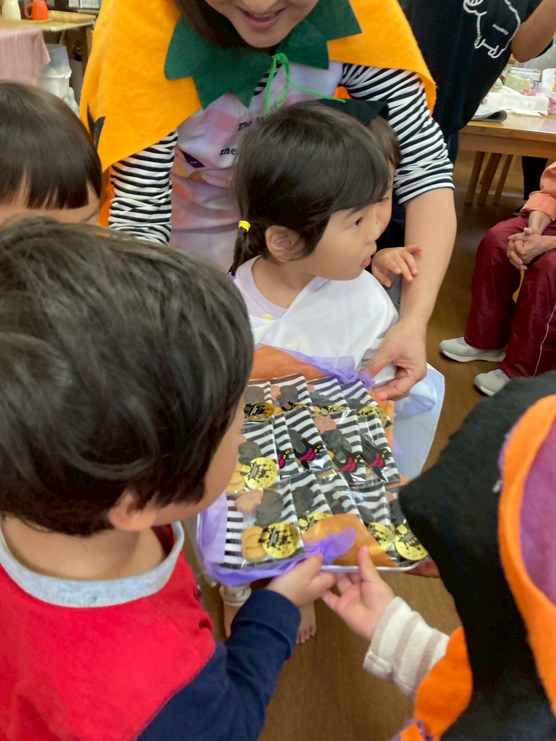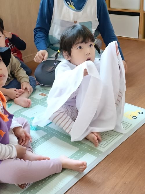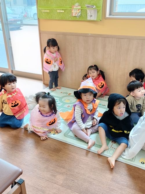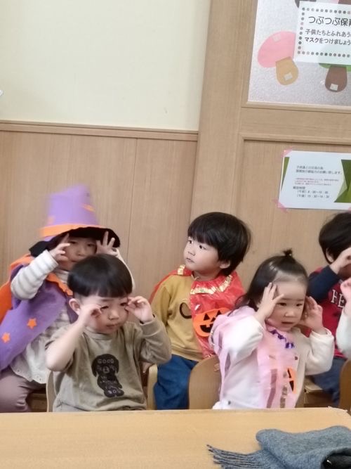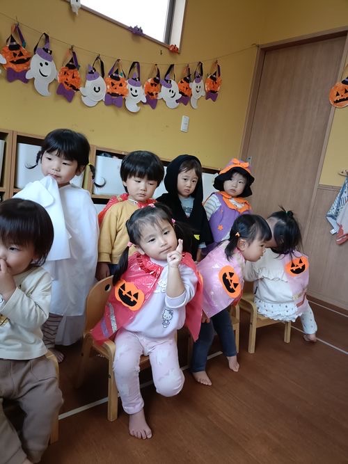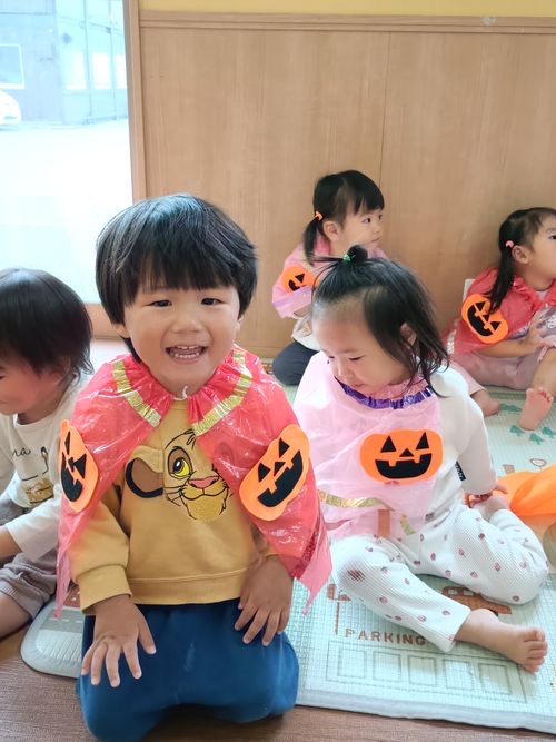 「ハロウィン🎃ってなんだろう!」のお話を聞いて、保育者から「みんなもおばけちゃんに変身してみる?」の提案にノリノリの女の子、怖がりの男の子!と様々😊