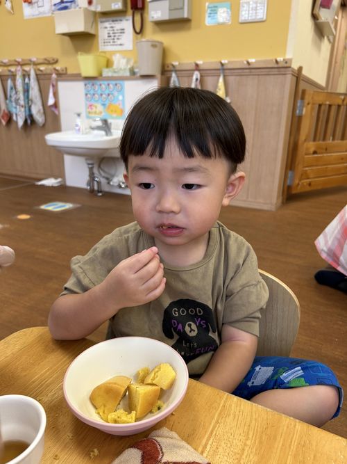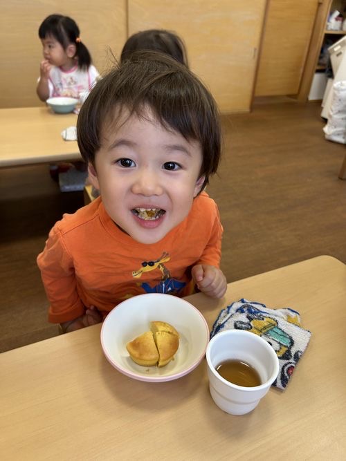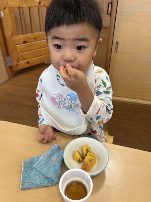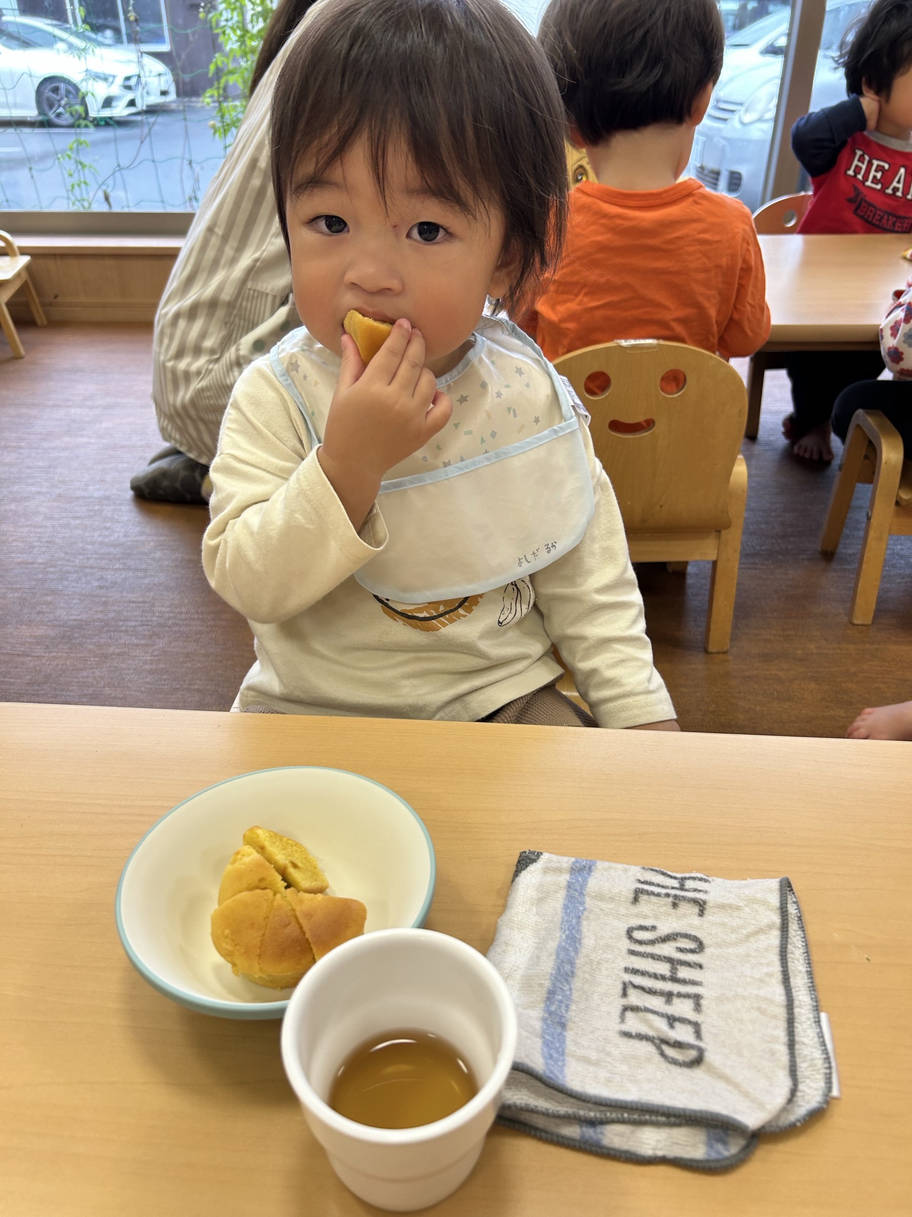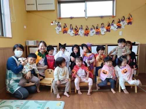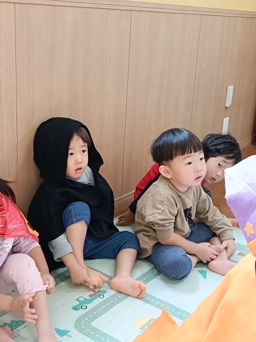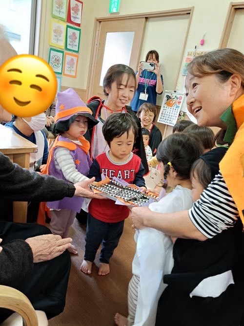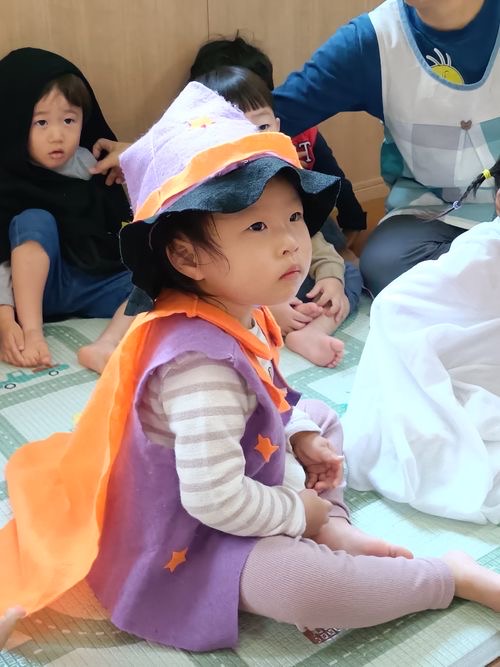 「ハロウィン🎃ってなんだろう!」のお話を聞いて、保育者から「みんなもおばけちゃんに変身してみる?」の提案にノリノリの女の子、怖がりの男の子!と様々😊