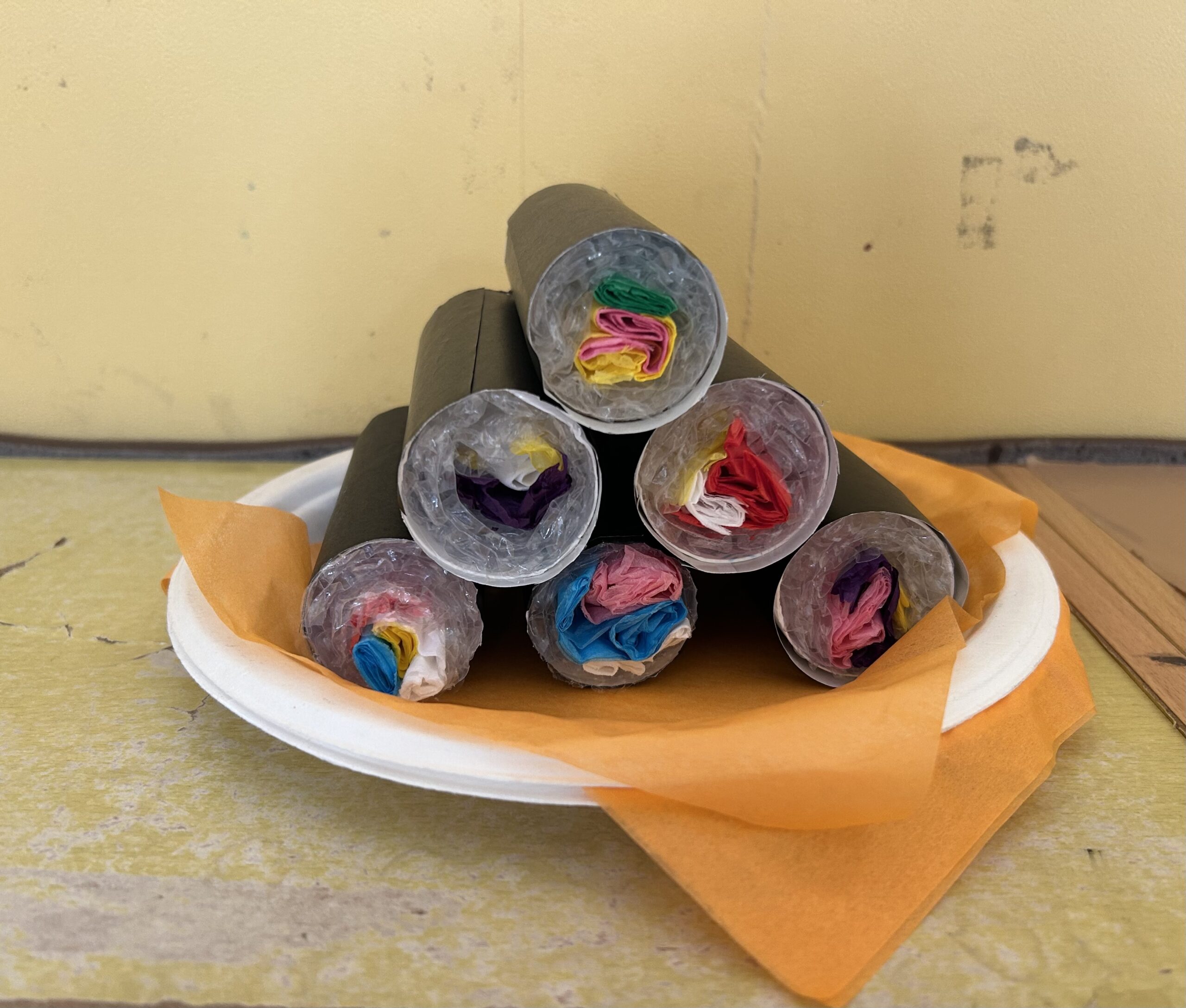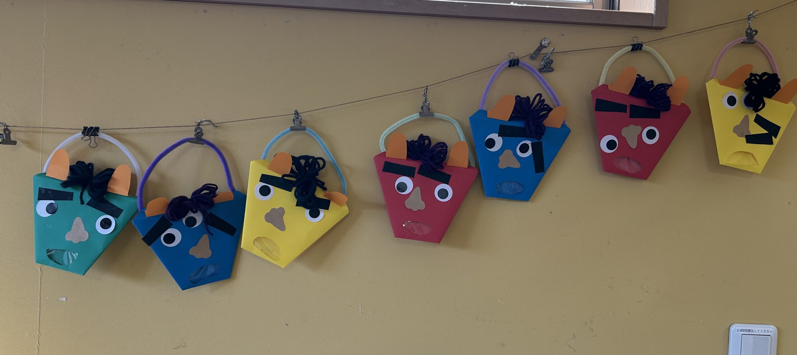 みんなで作ったオニの豆入れと恵方巻をお土産にしました。