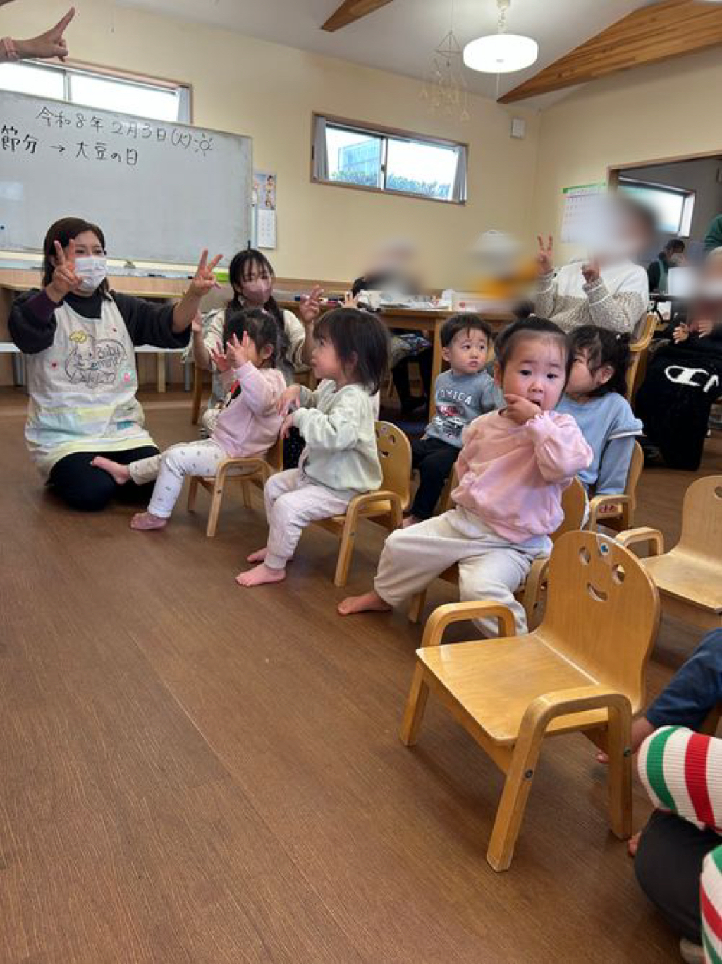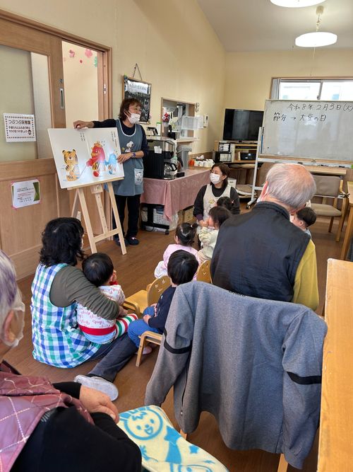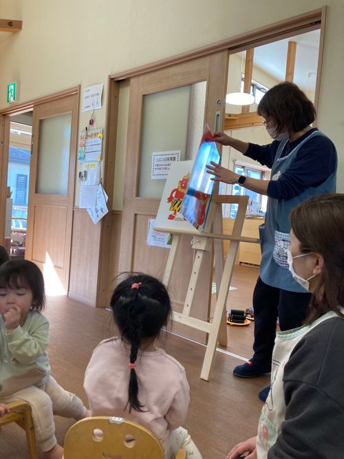 その後、おむすびさんとの交流では、「オニのパンツ」の大型絵本を見ながら…歌いながら…歌と手の動きをみんなで練習!