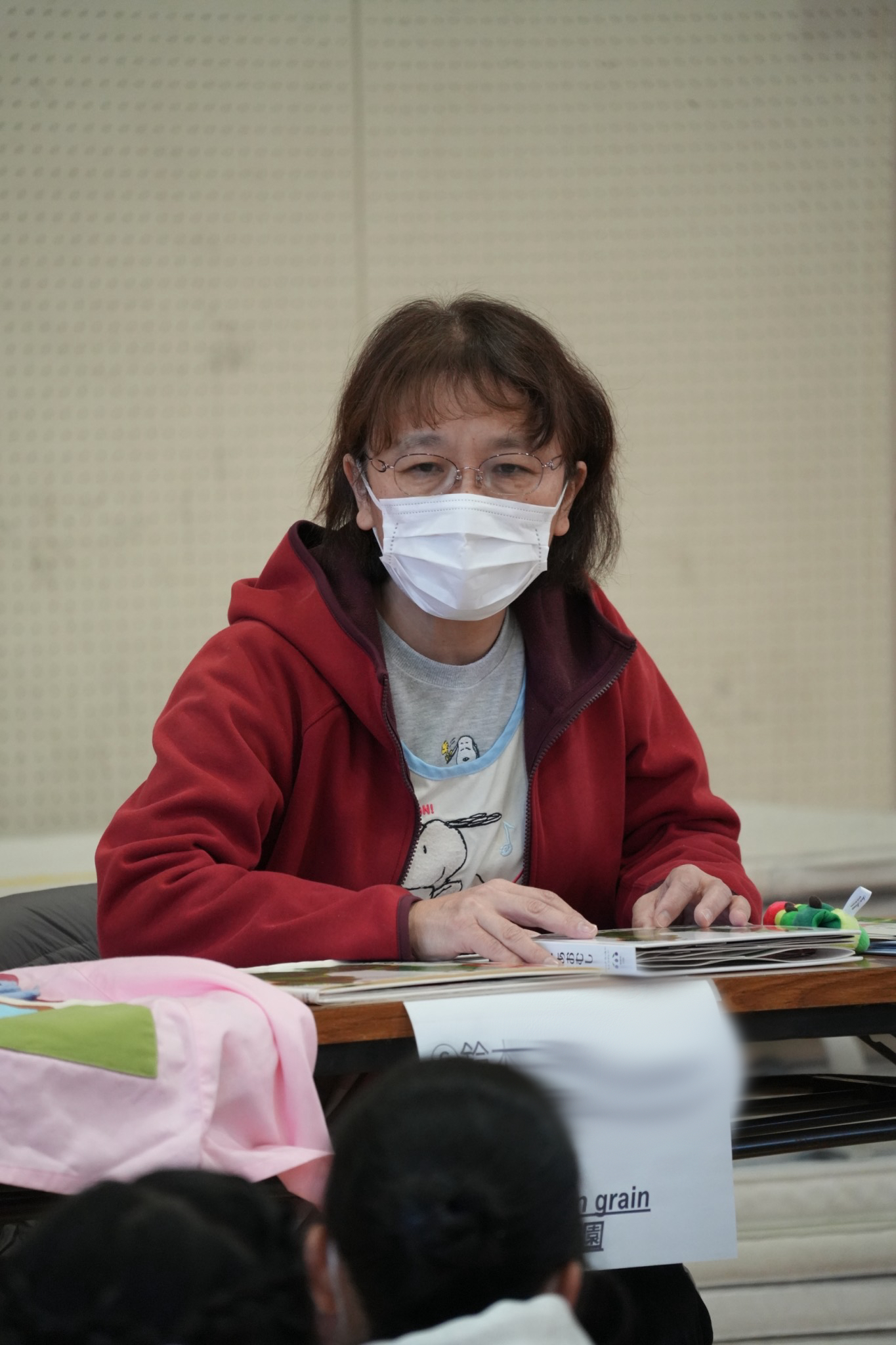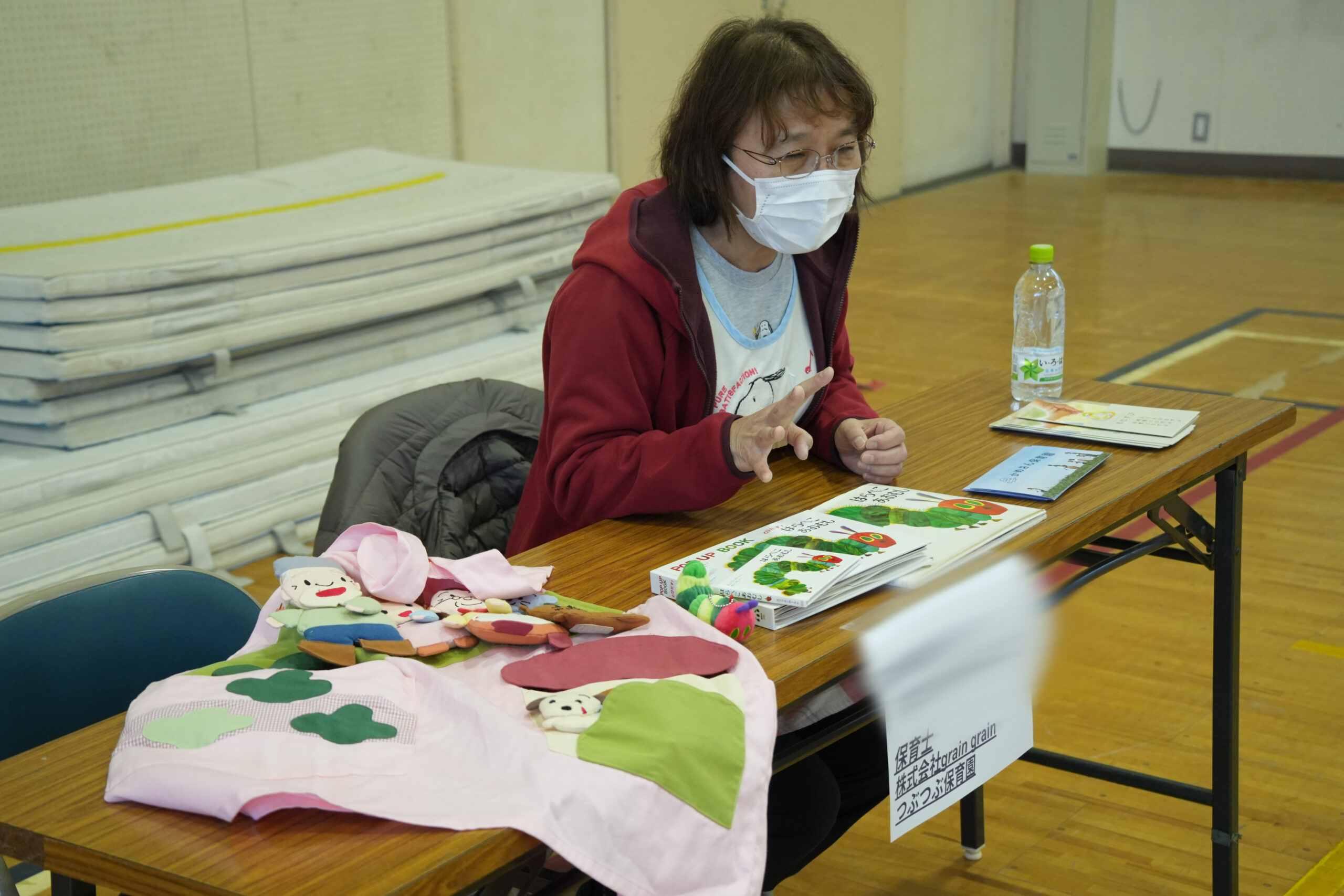 いろいろな大きさやとび出す絵本などで「はらぺこあおむし」を紹介すると、「うわぁ、懐かしい!」「こんな小さい本もあるんだ」などの声が上がってきたり、見入りながら小さい頃を思い出し、「保育園で読んでもらった」という声も聞こえて、だんだん和んできました。